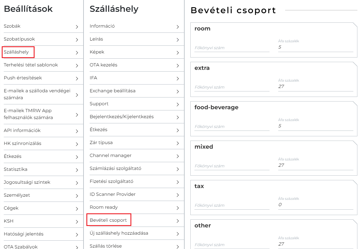 (Jó tudni!: Az extra, mixed és az other bevételi csoportot a szálláshely dönti el, hogy pontosan milyen bevételnek nevezi ki. Példa: az 5% ÁFA tartalmú étel és italon kivül a szálláson elérhető 27% ÁFA-val terhelendő étel és ital. Mivel nincs lehetőség kétféle ÁFA kulcsot rendelni a food-beverage csoporthoz, így a 27%-os kulcshoz kineveztehti/használhatja az extra, mixed vagy other csoportokat)