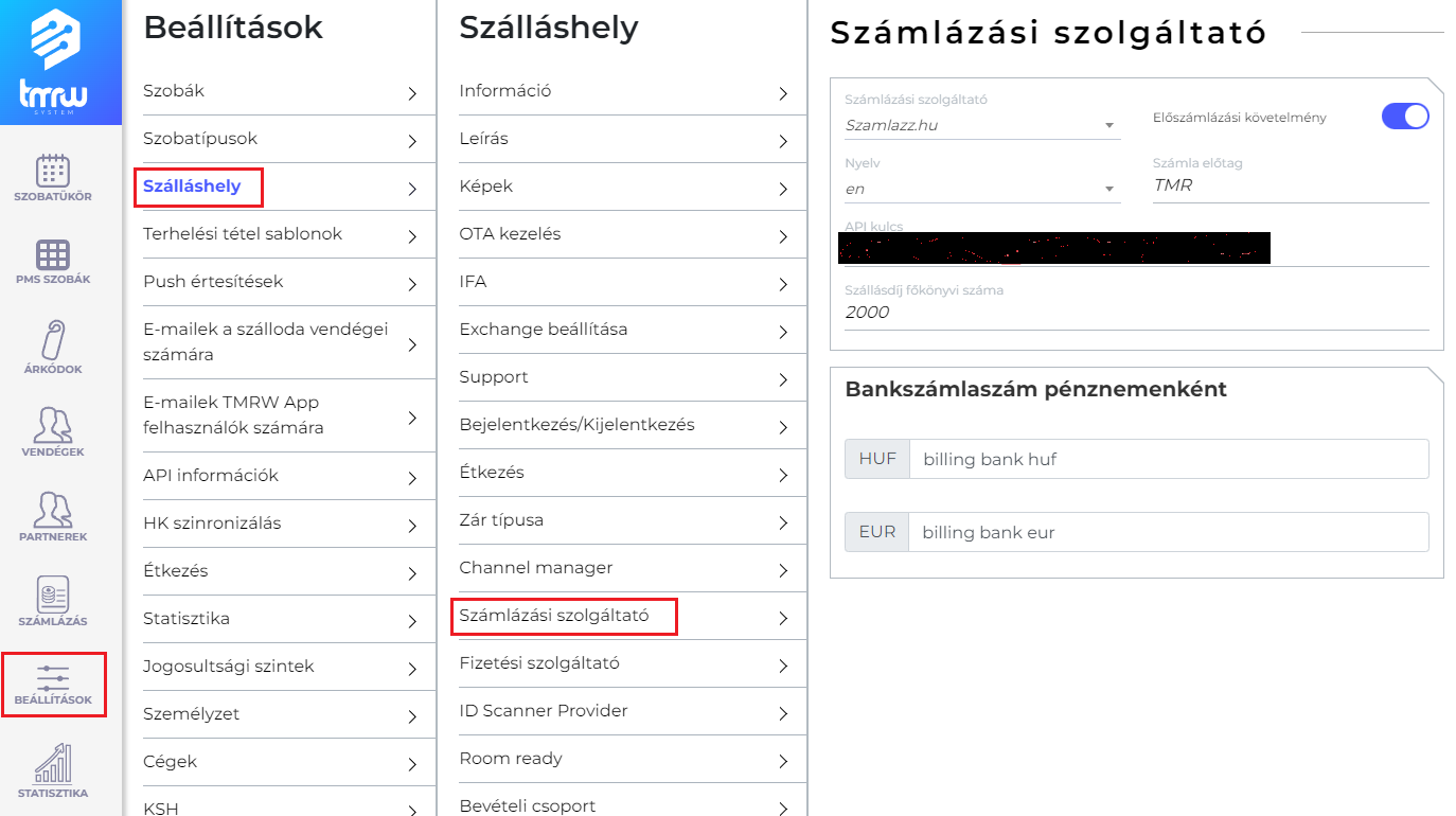 Beállítások / Szálláshely / Számlázási szolgáltató menüpontban találhatóak