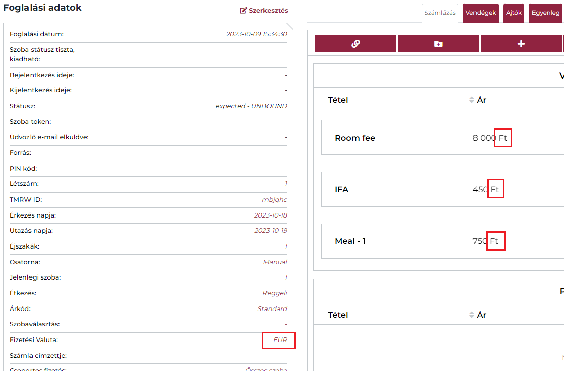 A rendszerben továbbra is a szálloda által preferált pénzemben látjuk a fizetési tételeket.