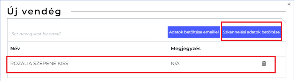 Egyszerre több vendég okmányát is van lehetőség scannelni és beküldeni egymás után (szkennel - ellenőriz - beküld - újra szkennel - ellenőriz - beküld - …. és így tovább), mely adatok beküldést követően a pms-ben a vendég adatlapon a „Szkennelési adatok betöltése / Load scan data” opcióval jelennek meg. Amennyiben scanneléskor adtunk megjegyzést az adott okmányhoz, az is megjelenik a Megjegyzés / Note oszlopban. Azon scannelt adatokra amikre nincs szükség, törölhetőek a mellettük találhatő „Szemetesláda” ikon használatával. A fel nem használt adatok másnapra automatikusan törlésre kerülnek a TMRW rendszeréből.