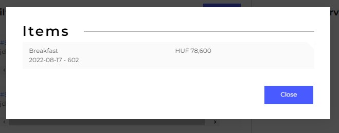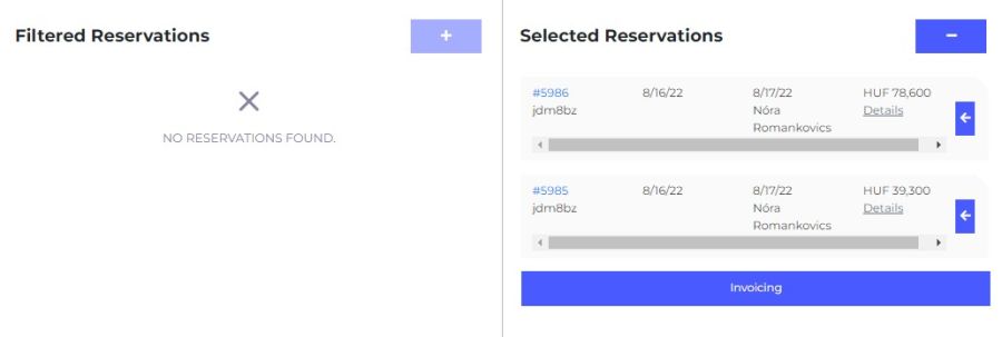 On the next page under "Filtered reservations", you can see the total value of the bookings (rooms) belonging to the given TMRW ID and their items sorted as partner payments in the currency specified on the bookings. Attention! You can only invoice items set to the same currency! By clicking on *„Details”* you can check what items belong and with what amounts to each rooms.