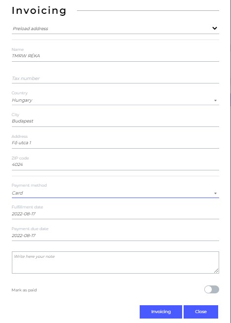 If you are invoicing for items that have already been paid, mark the invoice as paid. If you want to add a comment to the invoice, you can do so in the comment window. If the payment is made later after the invoice has been issued, you can set the invoice as paid at a later date. To do this, select the invoice in the Invoicing menu and mark it as paid. (The unpaid invoice will be highlighted in red in the list and will turn green once it has been set to paid)