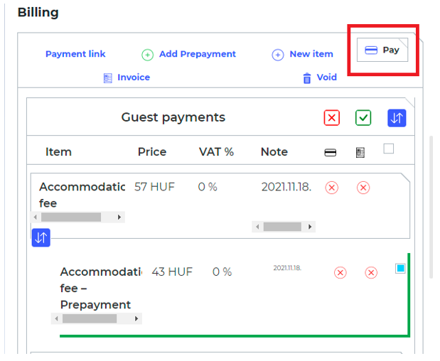 If the guest has transferred the amount based on the sent proforma, you can set the item to paid and since the billing information was filled in correctly in the past, the prepayment invoice will be created automatically.