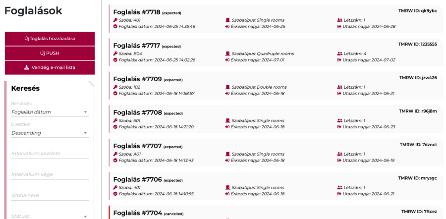 Szűrt foglalásoknak push küldése manuálisan: Foglalási listában leszűrt foglalások számára Új PUSH küldésére gomb