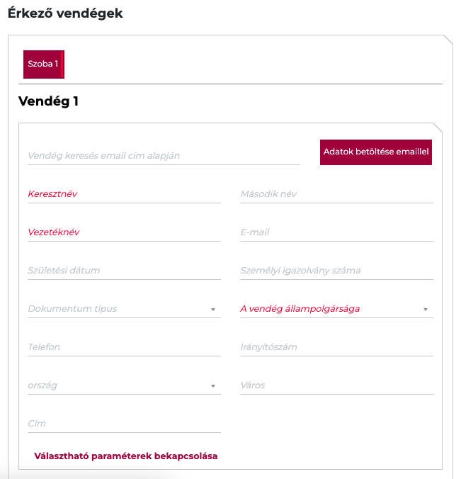Foglalás létrehozásához a szükséges minimum információ: legalább az egyik vendég kereszt és vezetékneve, valamint állampolgársága. Ezeket a kötelező minimum adatokat a rendszer pirossal kiemeli.