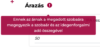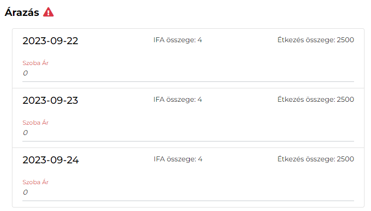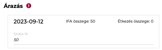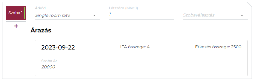 Az Árazásnál láthatja éjszakánként milyen szállásdíjjal és IFA összeggel fog létrejönni a foglalás. (Az árakat kézzel lehet módosítani, százalékos idegenforgalmi adó esetén az érték dinamikusan változik a beírt ár függvényében). Amennyiben a kiválasztott árkód nincs beárazva a Flowban (ld. Árazás ), akkor mindenképpen kézzel szükséges megadni az árakat éjszakánként lebontva. A rendszer csak figyelmezteti, hogy a szobaegyenleg nem lehet nulla vagy kevesebb, azonban a foglalás ár nélkül is létrehozható.