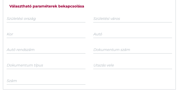 A Választható paraméterek bekapcsolásával további adatokat van lehetőség megadni a vendéghez. Pl. Születési ország, Születési város, Kor, Nyelv, Rendszám, IFA, stb.
