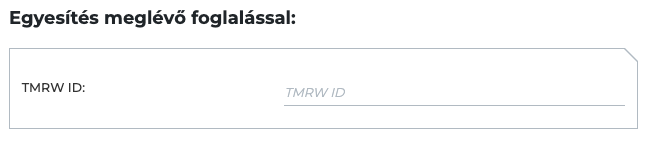 A korábban létrehozott foglaláson szereplő TMRW ID-t az alábbi képen látható sorra kell beírni, így a két foglalás egyesül. Onnantól több szobás foglalásnak minősül. ld. Több szobás, Csoportos foglalás hozzáadása