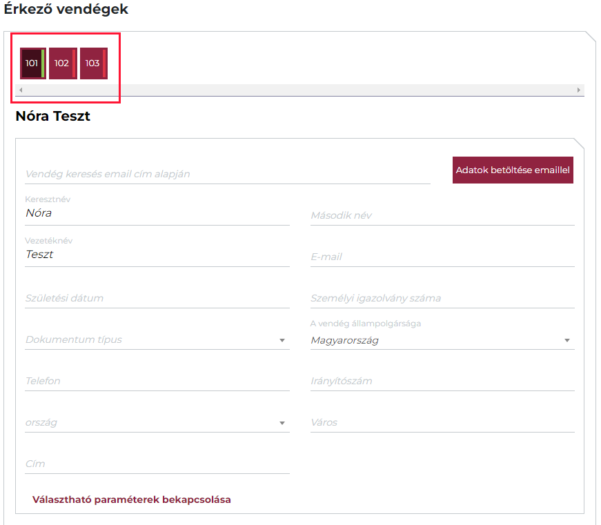 A foglalás véglegesítéséhez szükséges minimum adatokat a jobb oldalon található vendég adatlapon tudja kitölteni. A szobák számával egyező mennyiségű füleken, az adott szobához tartozó vendégek létszámának megfelelő adatlap jön létre.
