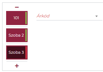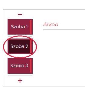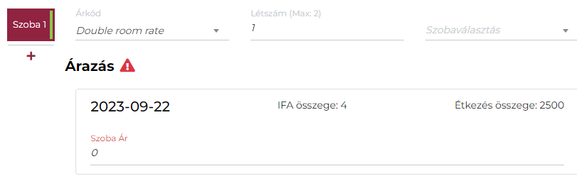 Egy árkódot kötelező megadni! Amennyiben nem került árkód megadásra a szobához, addig piros csíkkal jelzi a rendszer a hiányt. Ezután adható meg a létszám és van lehetőség konkrét szobát kiválasztani.