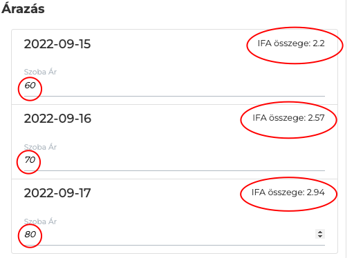 - árazás Árkód választás, mely után az árak megjelennek éjszakákra lebontva a szálláshely által használt alap pénznemben. A szobaár kézzel szabadon módosítható. Az IFA értékét is megjelenítjük, mely százalékos idegenforgalmi adónál dinamikusan változik a beírt ár függvényében.