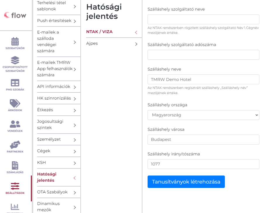 A Beállítások/Hatósági jelentés/”NTAK/VIZA” menüpontban ki kell tölteni az adatlapot azokkal az adatokkal, amikkel az NTAK felületén regisztrálva lett a szállás.