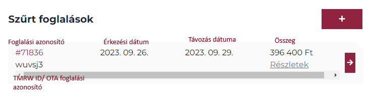 A megnyíló oldalon a „Szűrt foglalások” alatt láthatóak az adott TMRW ID alá tartozó foglalások (szobák) és azok partner fizetései alá rendezett tételinek összértéke a foglalásokon megadott pénznemben.