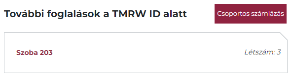 A gomb megnyomásával átkerül a felhasználó a Számlázás menüpontból is megnyitható Csoportos számlázás oldalára, ahol az általa számlázni kívánt egy TMRW ID alatt szereplő foglalások (szobák) kerülnek felsorolásra.
