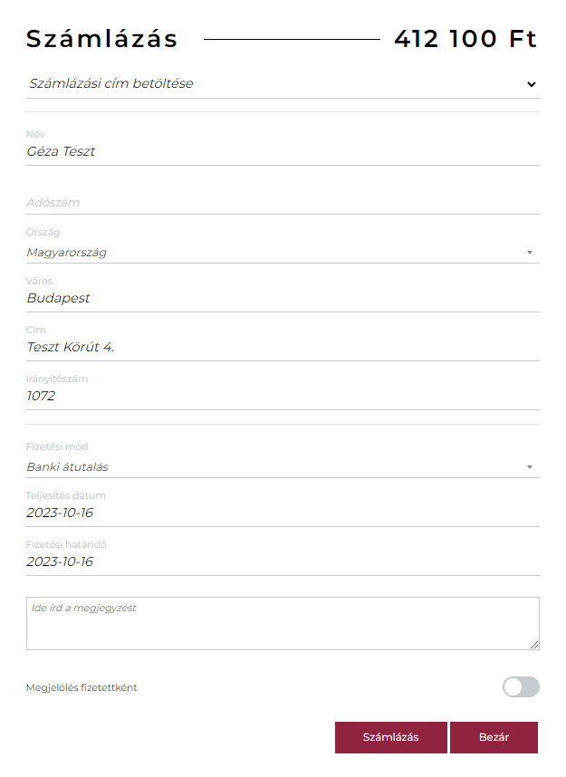 Amennyiben már fizettet tételekről készíted a számlát, akkor jelöljd meg fizetettnek a számlát. Ha szeretnél további megjegyzést írni a számlára, azt a megjegyzés ablakban teheted meg.