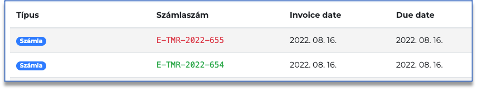 (A fizetetlen számlát piros színnel jelöljük a listában, fizetettre állítást követően zöld színűre vált).
