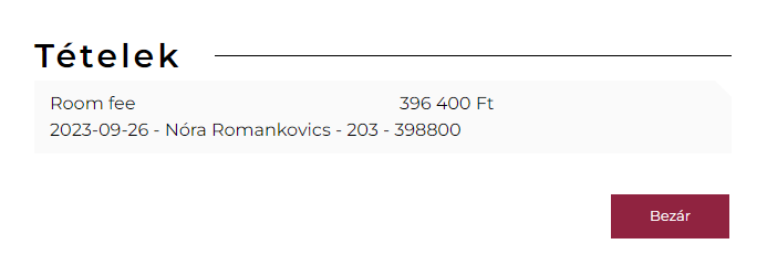 A „Részletek”-re kattintással ellenőrizhető milyen tételeket tartalmaznak és milyen összegekkel az egyes foglalások (szobák).