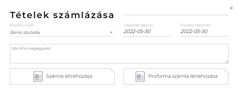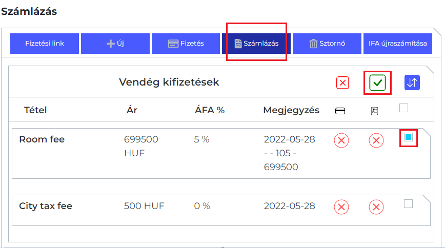 A foglalás adatlapján jobb oldalt a “*Számlázás*” ablaknál a “*Számlázás” gomb* megnyomása után ki kell választani a listában található tételek közül, mit szeretne a felhasználó számlázni, majd a zöld pipa megnyomásával a megjelnő ablakban beállítható a fizetési mód, teljesítési dátum, fizetési határidő, valamint számla megjegyzés is megadható. Ezután “*Számla létrehozása*”.