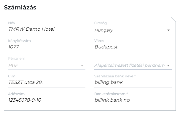- Számlázási szolgáltató megadása, a számla nyelve, előlegszámla engedélyezése, Szállásdíj főkönyvi számának megadása, EUR és HUF bankszámlaszám beállítása a