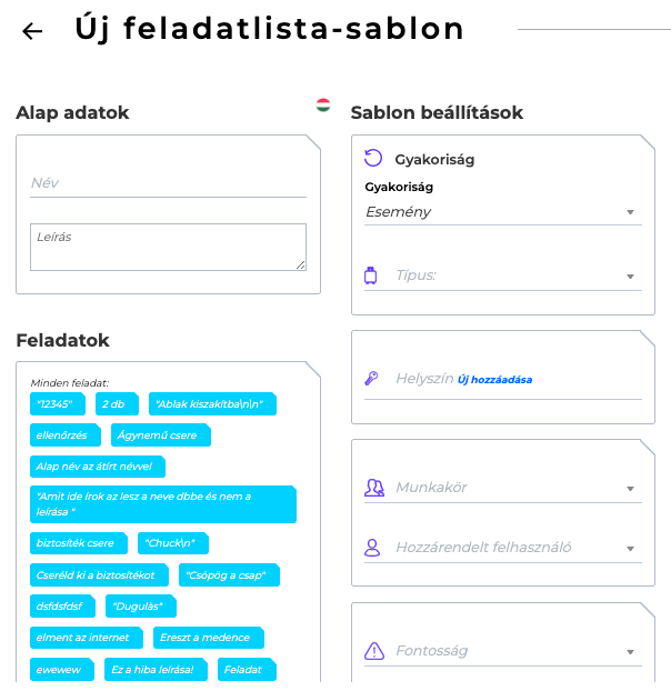 A karbantartónak létrehozható riport feldatok sablonjait van lehetőség itt létrehozni.