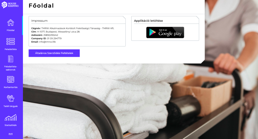A főoldalon található az oldal impresszuma, az ÁSZF és a mobil applikáció letöltéséhez a Google Play link.