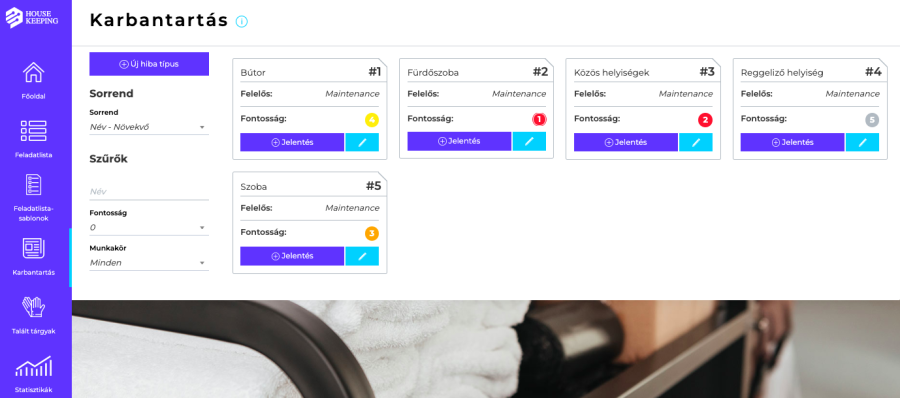 A feladatok minden esetben a feladat típus sablonjában megadott prioritás szerint kerülnek sorrendezésre. Egy prioritási szinten belül a szobák szobaszám szerint növekvő sorrendben követik egymást.