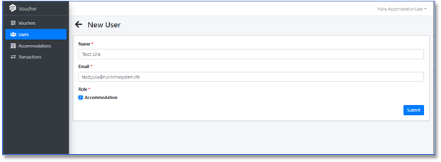 Admin jogosultsággal itt lehet új felhasználót felvenni a rendszerbe. Akik csak a Vouchers és a Transactions menüpontokat látják.