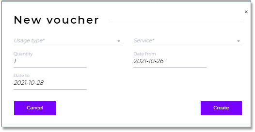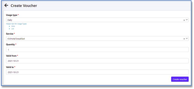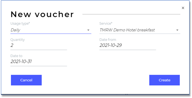 New voucher gombbal az alábbi ablakban tudjátok beállítani a voucher típusát (naponta ismétlődő, teljes időszakra vonatkozó, korlátlanul felhasználható), a szolgáltatást (pl. reggeli), a mennyiségét, és az időszakot amire szól.