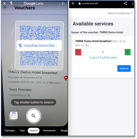 A reggeliztetőknél a kijelölt ember beolvassa a telefonjával a QR kódot (bármilyen QR kód olvasóval ami van a telefonján), ami tovább irányítja a voucher felületére. Amennyiben nincs bejelentkezve a felhasználójába, akkor be kell jelentkeznie és ezután tudja megadni, hogy hány vocher kerül felhasználásra. ÉS kész!
