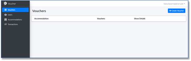 Ebben a menüpontban lehet az e-mailben kiküldhető vouchereket létrehozni (azoknak a vendégeknek, akik nem szeretnék a TMRW Hotels/Apartments applikációt használni). Itt tudunk a jobb felső sarokban található create voucher gombbal újat létrehozni.
