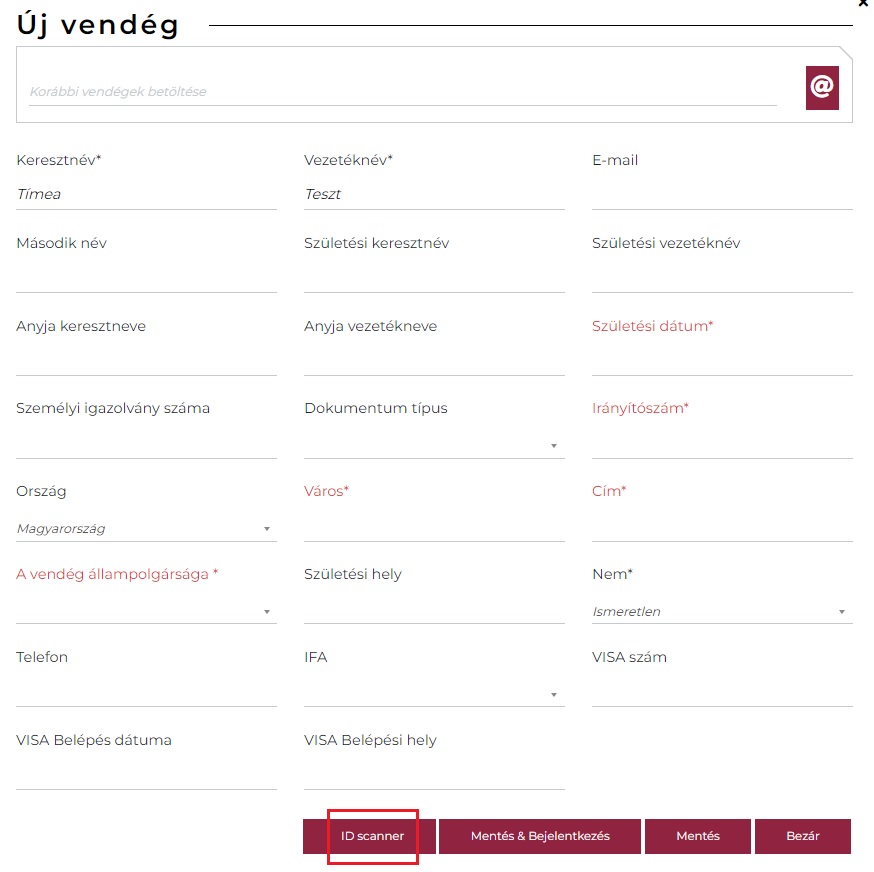 Ezután az okmányokról beolvasott adatokkal a vendég adatlapja kitöltésre kerül.