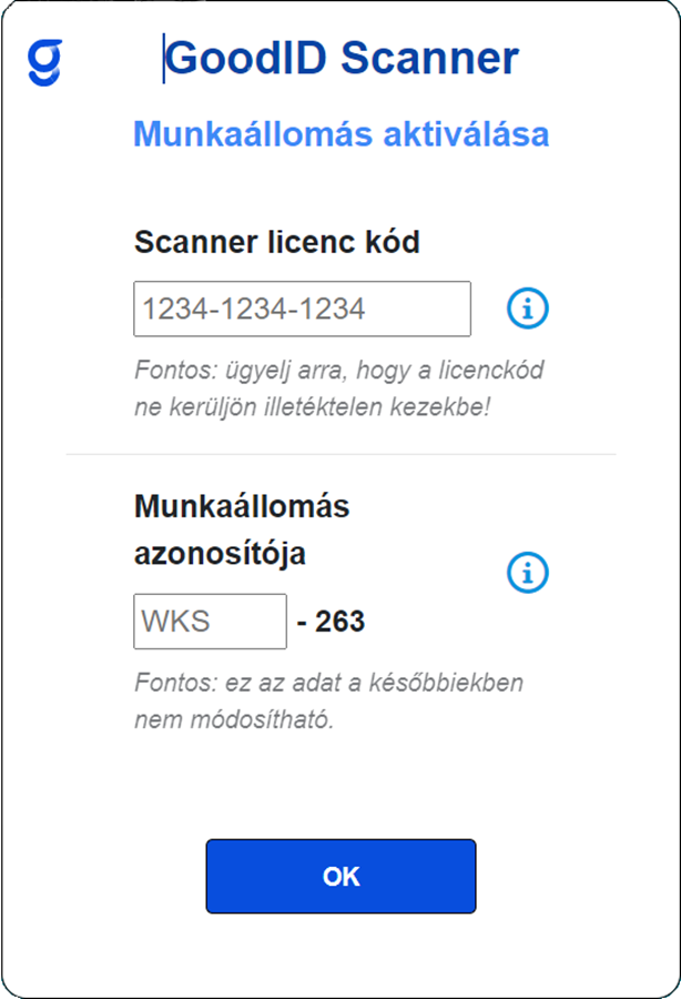 Adjon meg egy tetszőleges munkaállomás-azonosítót. Ezzel az azonosítóval választható ki a későbbiekben, hogy a GoodID Scanner mely munkaállomásra küldje el a beolvasott adatokat.
