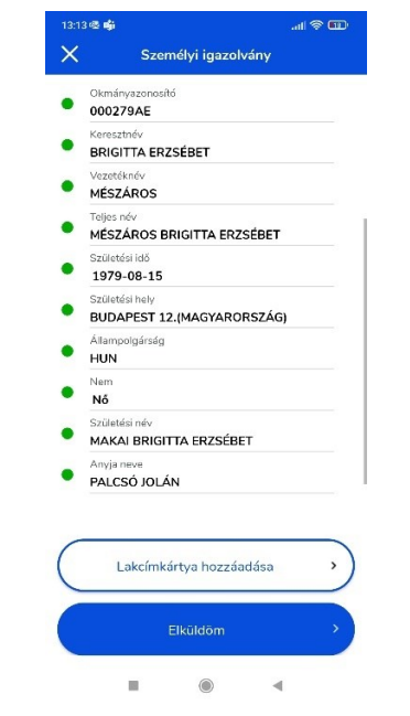 Az okmányadatok ellenőrzése és szükség szerinti javítása után nyomjon az Elküldöm gombra. Ekkor a GoodID alkalmazás elküldi a kiválasztott munkaállomásra az okmány adatait.
