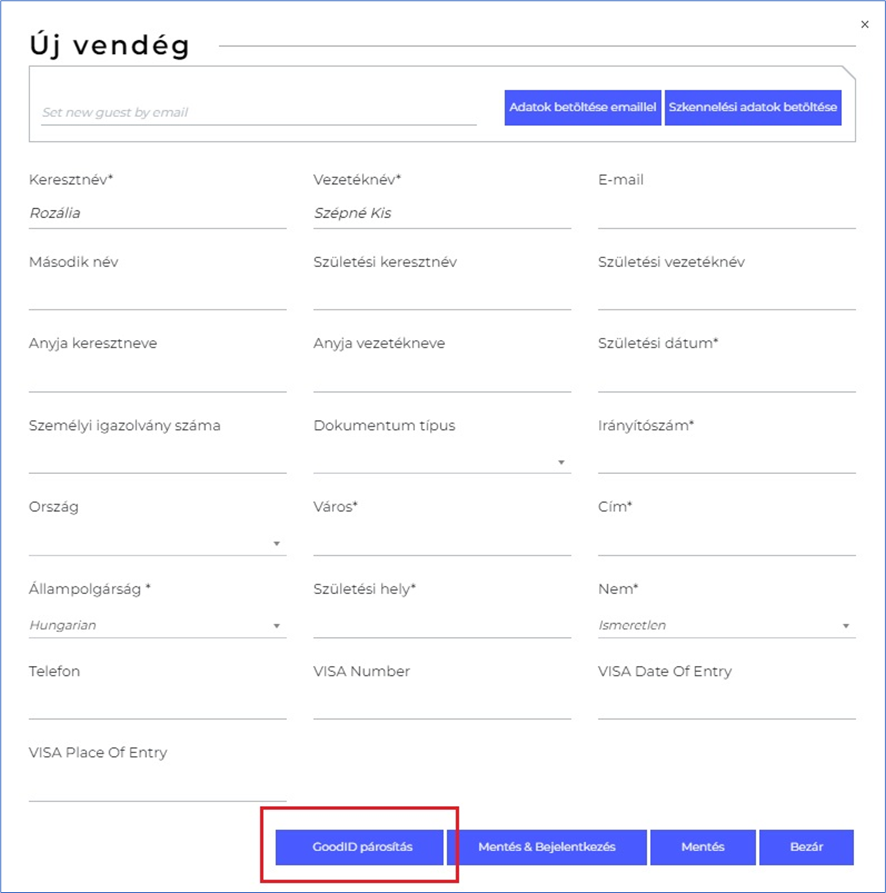 Mivel a szálláshely beállításokban beállítottuk a scannert, így a foglalásokban az „Érkező vendégek/Expected guests” ablakában a vendég adatlapokat megnyitva megjelent a „GoodID párosítás” gomb, melynek segítségével az alábbi pontokban részletezett módon adható meg a licenc kód és párosítható a munkaállomásunkkal a GoodID scanner.